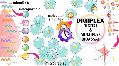The sensitive and accurate detection of panels of microRNA molecules is critical to enable their use as disease biomarkers. While microarrays and next-generation sequencing allow comprehensive miRNA profiling, they generally suffer from low accuracy and sensitivity. Conversely, digital bioassays such as digital PCR provide an absolute quantification with unrivaled sensitivity, although with limited multiplexing capabilities. In this work, we describe a novel microRNA profiling procedure, termed Digiplex, that combines the multiplexing power of a DNA-grafted suspension array with the accuracy of a digital flow cytometry readout. microRNAs are first captured on fluorescently encoded DNA-grafted particle populations following a Poisson distribution. The particles are subsequently isolated in microfluidic droplets, where single captured miRNA molecules trigger an isothermal exponential amplification that ultimately activates a fluorescent probe on the particle surface. Flow cytometry analysis yields the ratio of positive to negative particles for each targeted microRNA, allowing the reconstruction of the multiplex concentration profile in one go. After optimizing the workflow on a single microRNA model, we successfully developed a 10-plex assay with femtomolar sensitivity. The Digiplex method was finally validated on total RNA samples and benchmarked against droplet digital PCR.
