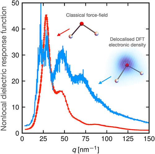 The nonlocal dielectric properties of liquid water are studied in the context of ab initio molecular dynamics (AIMD) simulations based on the density functional theory. We calculate the dielectric response from the charge structure factor of the liquid using the fluctuation–dissipation theorem. We show that the dielectric response function of ab initio simulations differs significantly from that of classical force-fields, both qualitatively and quantitatively. In particular, it exhibits a larger amplitude and a wider range of responding wave numbers. We suggest that the difference is due to the localization of the electronic charge density inherent in both classical force files and Wannier post-treatment of DFT densities. The localized charge models do not reproduce the shape of the response function even for q corresponding to intermolecular distances, and could lead to a significant underestimation of the dielectric response of the liquid by a factor of 10.