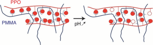 Self-assembly of polymers at liquid interfaces using noncovalent interactions has emerged as a promising technique to reversibly produce self-healing membranes. Besides the assembly process, it is also crucial to control the mechanical properties of these membranes. Here, we measure the interfacial rheological properties of PMAA–PPO (poly(methacrylic acid)-poly(propylene oxide)) polymer membranes assembled using hydrogen bonds at the interface between water and a polar oil, Miglyol. Varying the pH enables us to modify the degree of ionization of the PMAA chains and hence their ability to establish hydrogen interactions with PPO. Frequency sweeps of the interfacial layers show a crossover between a viscous regime at low frequencies and an elastic regime at high frequencies. The crossover elastic modulus, measured one hour after the two phases were put into contact, decreases by a half over the pH range investigated, which can be accounted for by a decrease of the layer thickness as pH increases. Furthermore, we find that the crossover frequency varies exponentially with the degree of ionization of PMAA. To account for these observations, we propose a simple picture where the short PPO chains behave as noncovalent cross-linkers that bridge several PMAA chains. The dissociation rate and hence the crossover frequency are controlled by the number of PO units per PPO chain involved in the hydrogen bonds.