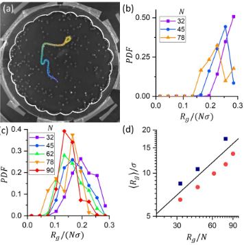 The configurations taken by polymers embedded in out-of-equilibrium baths may have broad implications in a variety of biological systems. As such, they have attracted considerable interest, particularly in simulation studies. Here we analyze the distribution of configurations taken by a passive flexible chain in a bath of hard, self-propelled, vibrated disks and systematically compare it to that of the same flexible chain in a bath of hard, thermal-like, vibrated disks. We demonstrate experimentally that the mean length and mean radius of gyration of both chains agree with Flory’s law. However, the Kuhn length associated with the number of correlated monomers is smaller in the case of the active bath, corresponding to a higher effective temperature. Importantly, the active bath does not just simply map on a hot equilibrium bath. Close examination of the chains’ configurations indicates a marked bias, with the chain in the active bath more likely assuming configurations with a single prominent bend.