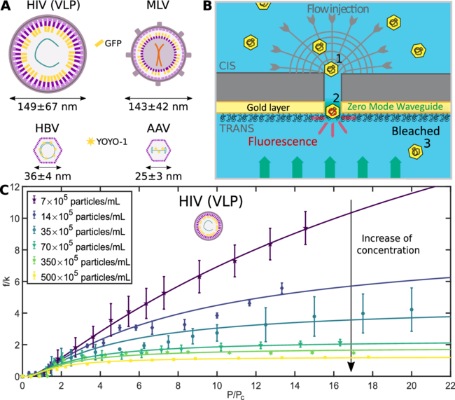 Viruses have remarkable physical properties and complex interactions with their environment. However, their aggregation in confined spaces remains unexplored, although this phenomenon is of paramount importance for understanding viral infectivity. Using hydrodynamical driving and optical detection, we developed a method to detect the transport of single virus in real time through synthetic nanopores. We unveiled a jamming phenomenon specifically associated with virus confinement under flow. We showed that the interactions of viral particles with themselves and with the pore surface were critical for clog formation. Based on the detailed screening of the physical and chemical determinants, we proposed a simple dynamical model that recapitulated all the experimental observations. Our results pave the way for the study of jamming phenomena in the presence of more complex interactions.